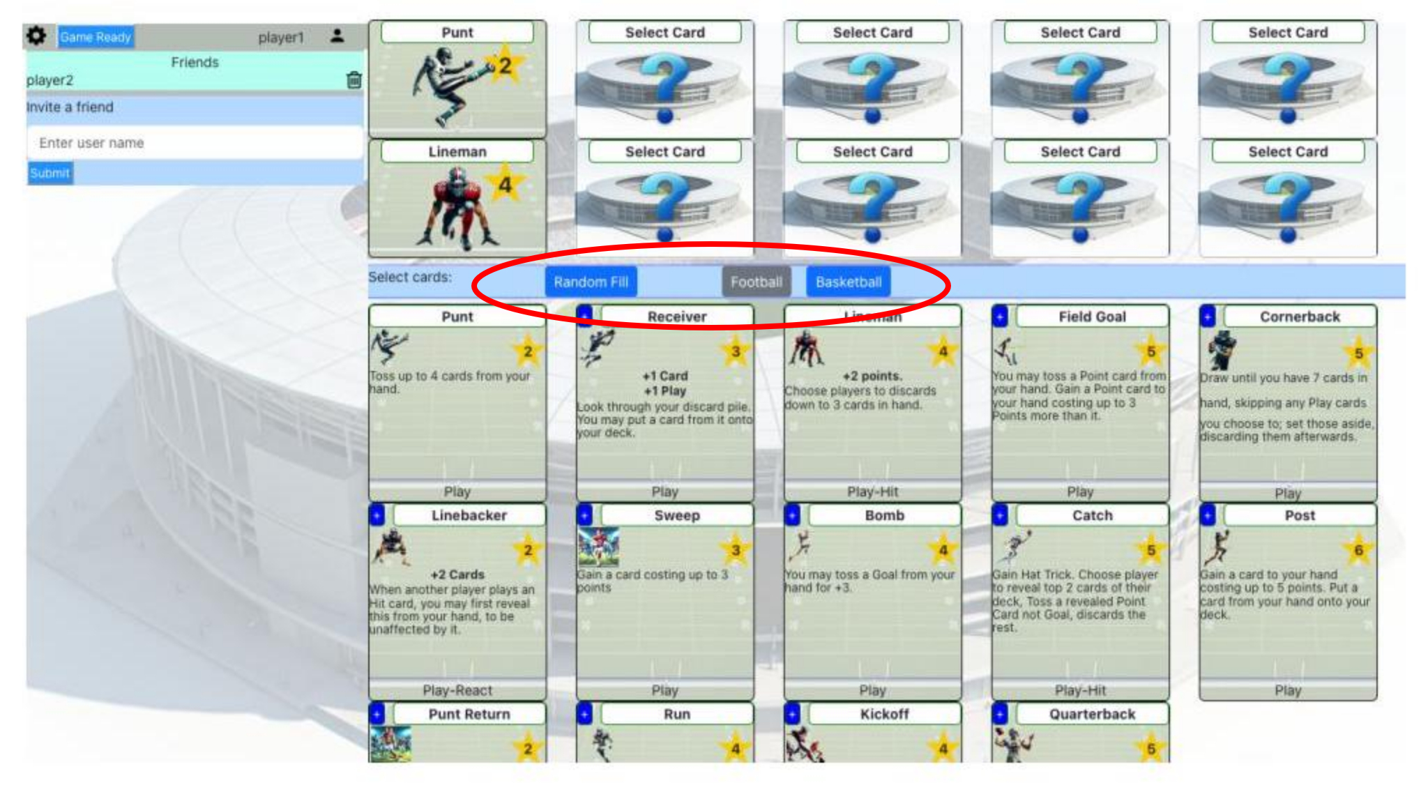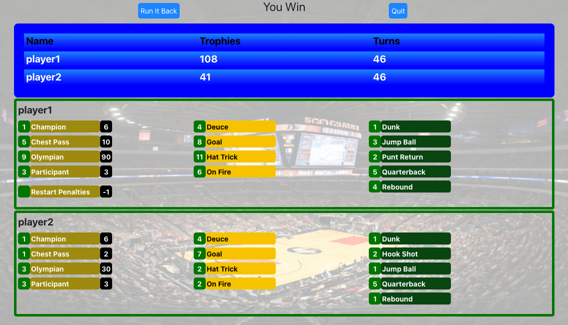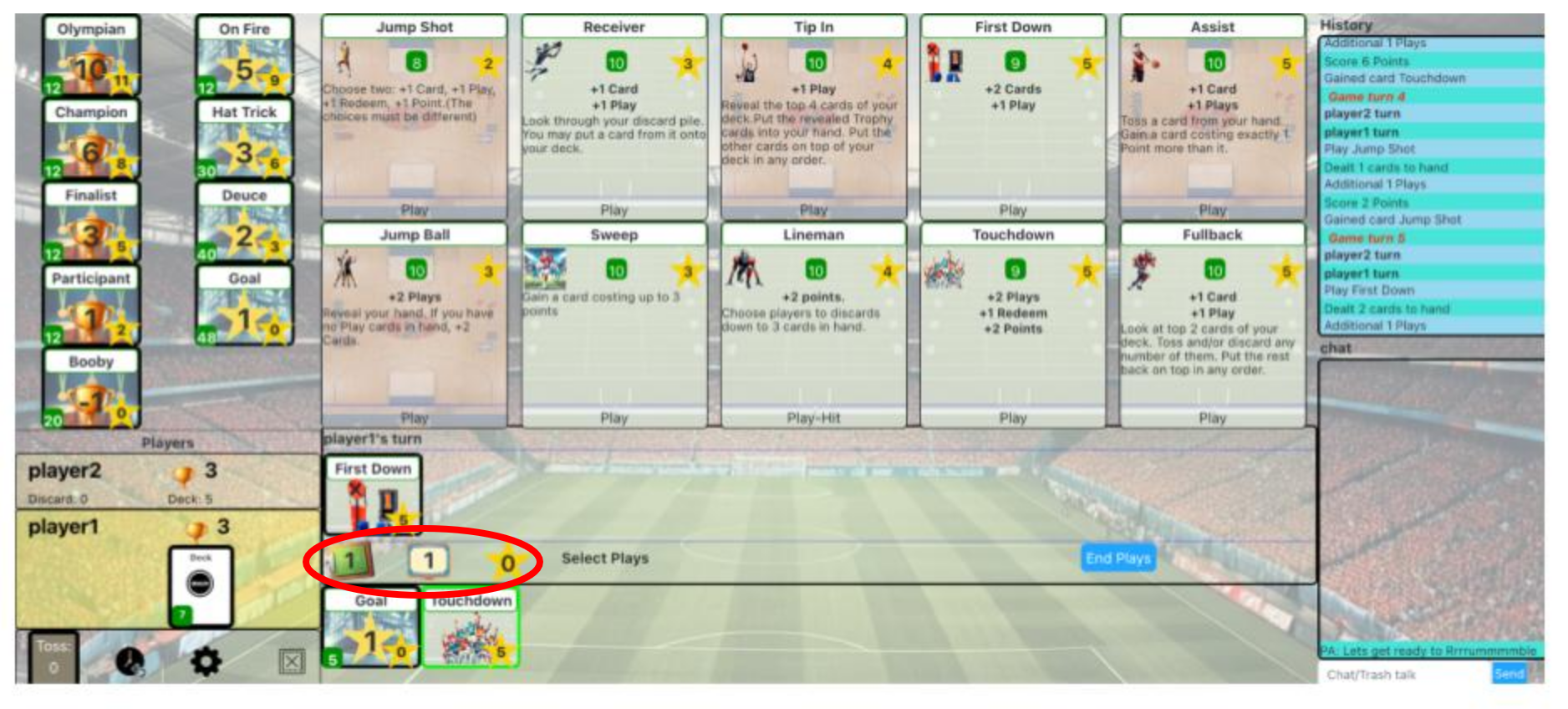Sportive is a online deck building card game with a sports theme. You compete against a Bot or other players, building up your playbook, gaining points, and redeeming them for trophies. The person with the most trophies at the end of the game wins.